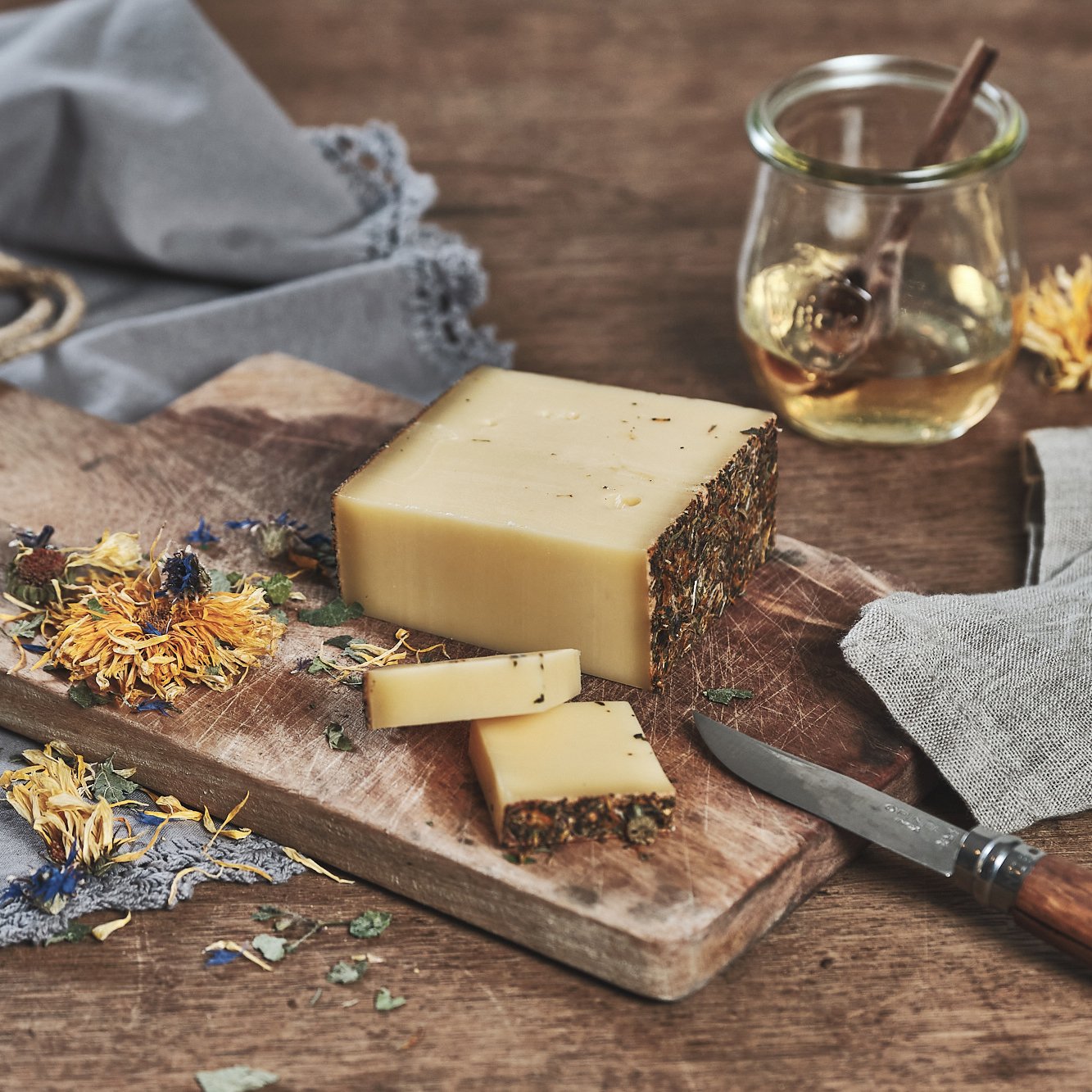 Nach mindestens 8-wöchiger Naturrindenreifung wird dieser Käse mit Akazienhonig und einer Wildblumenmischung affiniert. Der Blumenmantel macht diesen Käse nicht nur optisch, sondern auch geschmacklich besonders interessant.