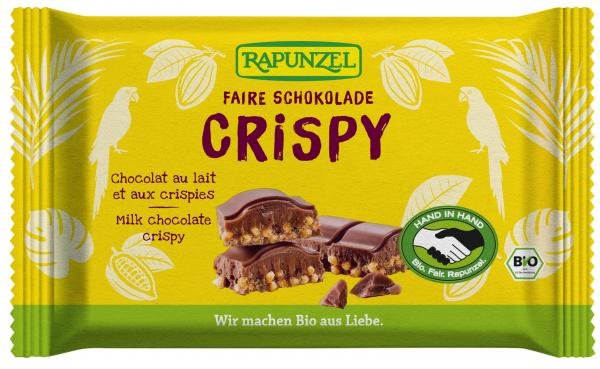 Knusprige Getreide-Crispies in zartschmelzender Vollmilchschokolade - fair gehandelt von Rapunzel HAND IN HAND-Partnern. Das intensive Conchieren ist neben den wertvollen Rohstoffen das eigentliche Geheimnis des wahren Schokoladengenusses. Durch die Kunst des Conchierens entwickelt sich der anfänglich noch verborgene Reichtum an kakaoeigenen Aromen Stufe um Stufe bis zur vollen Entfaltung. Gleichzeitig entsteht vollkommene Feinheit und der unvergleichlich zarte Schmelz.