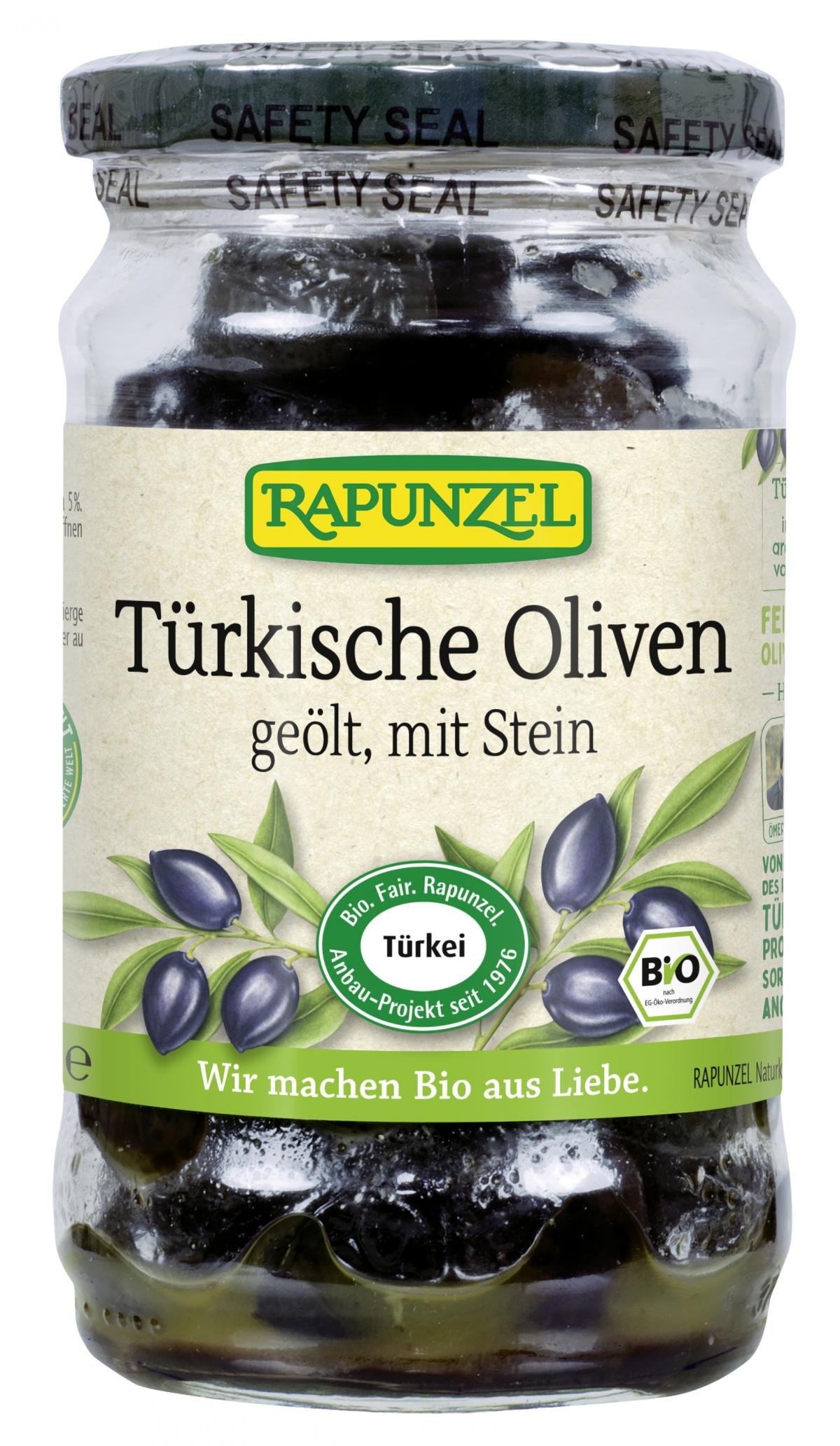 Handwerklich hergestellt nach traditionell türkischer Art. Die tiefschwarzen Oliven der Sorte ''Gemlik'', auch unter dem Namen ''Trilye'' bekannt, werden vollreif von Hand geerntet und stammen aus dem Rapunzel Türkei-Projekt. Durch einen speziellen 6-8-monatigen Fermentationsprozess erhalten sie ihren intensiv-aromatischen, vollmundigen Geschmack und ihr charakteristisches, leicht runzeliges Aussehen. Diese Oliven-Spezialität wird weder in Lake noch in Öl eingelegt: vor der Abfüllung werden die Oliven leicht mit Olivenöl nativ extra mariniert.