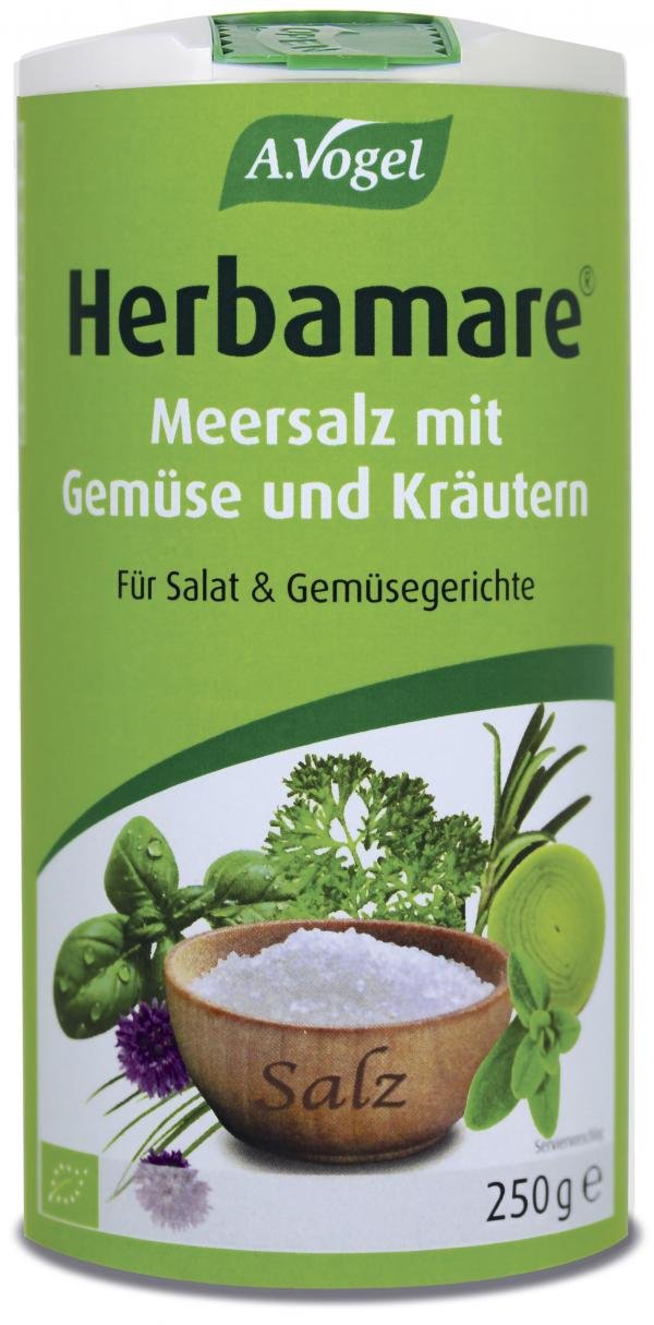 Herbamare® für Salat & Gemüsegerichte ist eine Mischung aus naturreinem Meersalz, 12 erntefrischen Gemüse- und Kräutersorten und der Meeresalge Kelp.