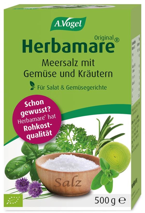 Herbamare® für Salat & Gemüsegerichte ist eine Mischung aus naturreinem Meersalz, 12 erntefrischen Gemüse- und Kräutersorten und der Meeresalge Kelp.