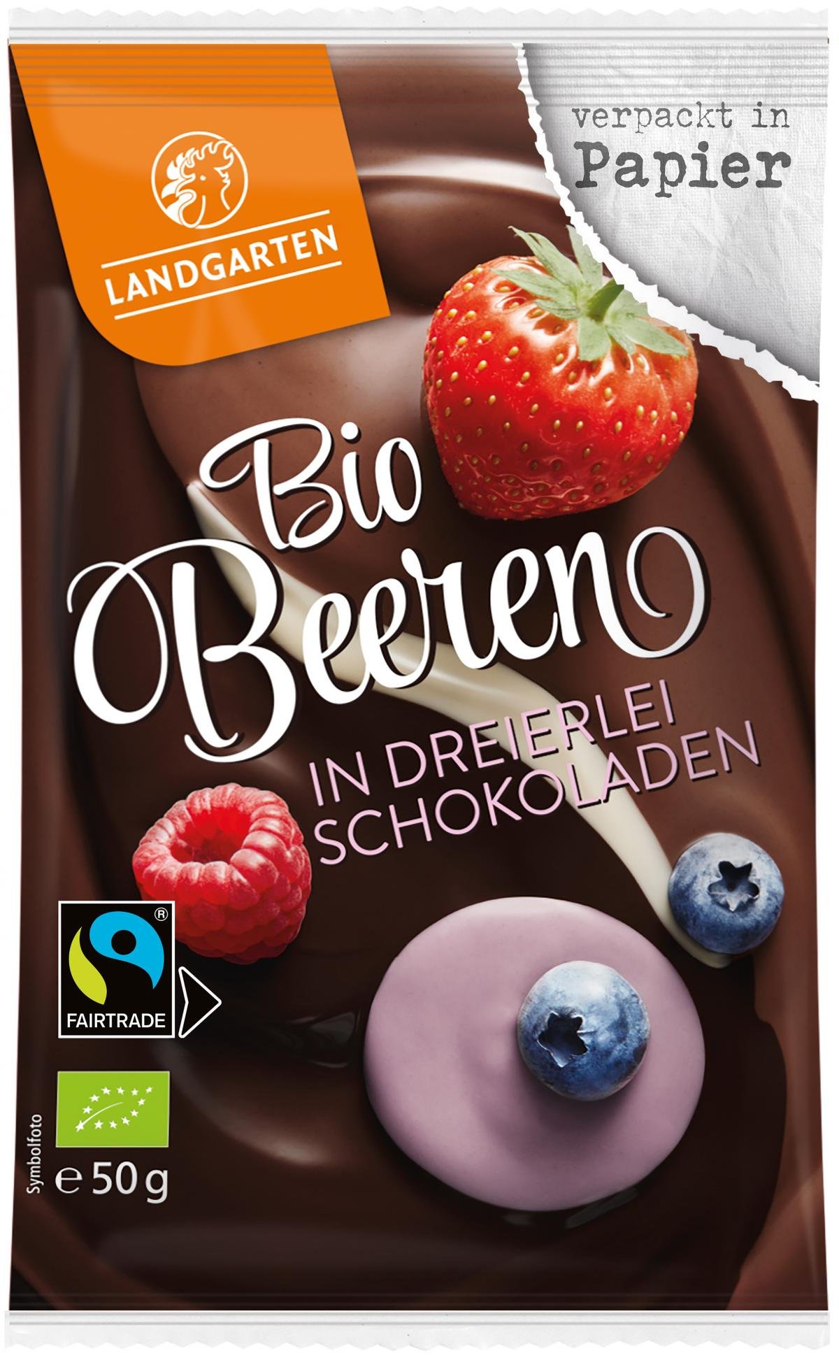 gefriergetrocknete Himbeeren in Zartbitterschokolade, gefriergetrocknete Heidelbeeren in weißer und lila Schokolade und gefriergetrocknete Erdbeeren in Vollmilchschokolade