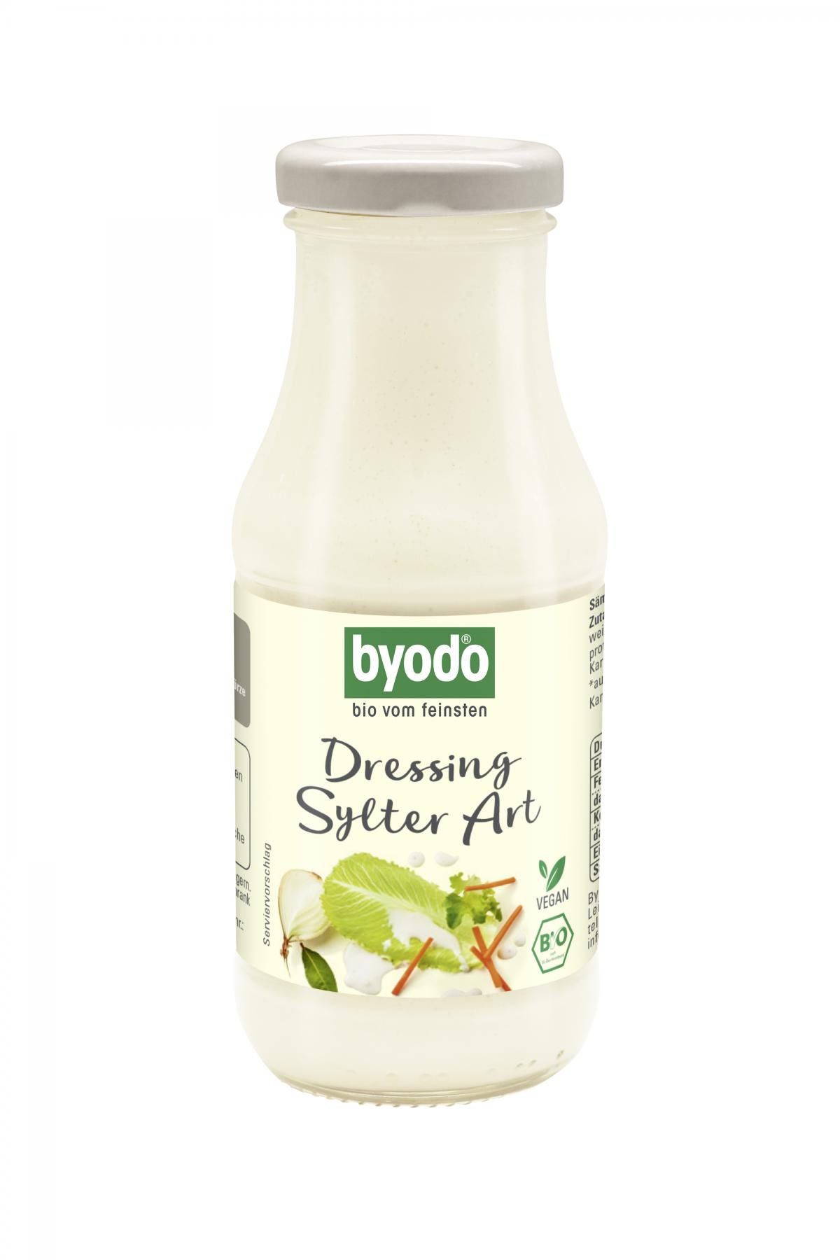 Das Byodo Dressing Sylter Art wird aus feinsten Bio-Zutaten hergestellt und ist garantiert glutenfrei, eifrei und vegan. Für die typische, dezente Gemüsenote im Salatsaucen-Klassiker sorgen fein gehackte Zwiebeln und Karotten. Statt Kristallzucker verleiht feinster Agavendicksaft dem veganen Bio-Dressing Sylter Art eine leichte, natürliche Süße. Es passt herrlich zu knackigen Eisberg- und Karottensalaten. Die praktische 245 ml-Flasche garantiert zudem ein einfaches Handling und Dosieren – kurz schütteln, über den Salat gießen und genießen. Nach dem Öffnen bitte im Kühlschrank aufbewahren.