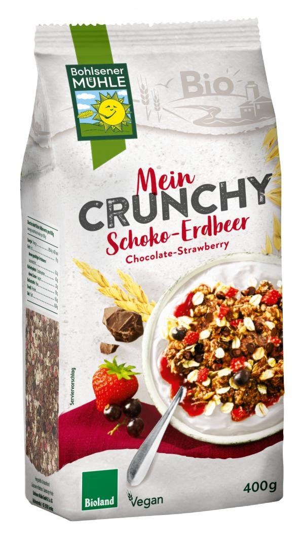 Das Getreide aus der Region wird in unserer Wassermühle in Bohlsen zu Flocken verarbeitet, bevor es zu knusprigem Schoko-Crunchy aus Hafer und Dinkel gebacken wird. Gemischt mit fruchtigen Erdbeeren und Johannisbeeren sowie feinherber Zartbitterschokolade für ein fruchtig-schokoladiges Geschmackserlebnis – Mein Crunchy. Mein Genussmoment.