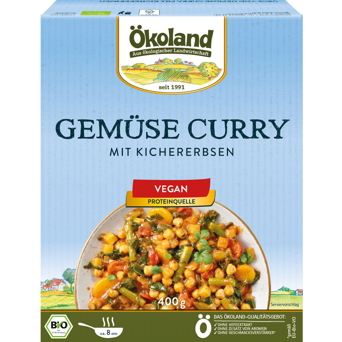 Kichererbsen und eine würzige Gemüsemischung mit Tomaten-Curry-Geschmack. Für die Ökoland Tiefkühlgerichte werden ausschließlich hochwertige Bio-Zutaten verwendet. Durch ein modernes und schonendes Herstellungsverfahren wird das Kochen enorm erleichtert. Die Zutaten werden dabei mit den Kräutern und Gewürzen so gemischt, dass sie die Gerichte in 6-10 Minuten fertig gegart sind.