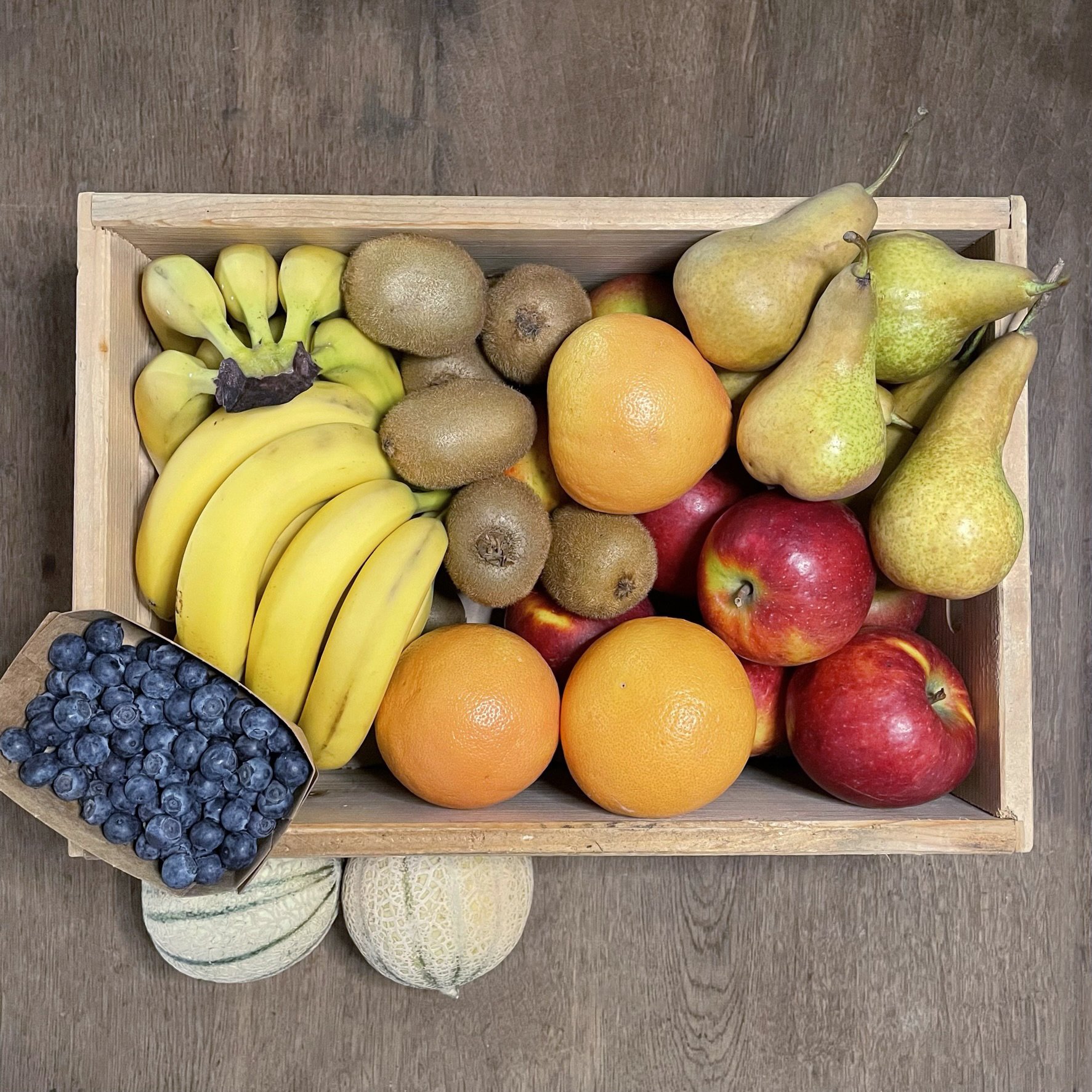 Wöchentlich wechselnde Bürokiste mit Obst zum Snacken! Standardmäßig sind Bananen und Äpfel, sowie saisonale Obstsorten für Zwischendurch enthalten.