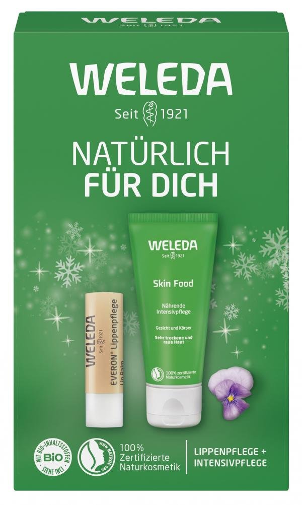 Das WELEDA Geschenkset Skin Food /Everon enthält die Skin Food 30ml. Sie beruhigt, schützt und pflegt spröde, trockene und raue Haut. Außerdem enthält das Set den Everon Lippenpflegestift, der die Lippen pflegt und vor dem Austrocknen schützt.
