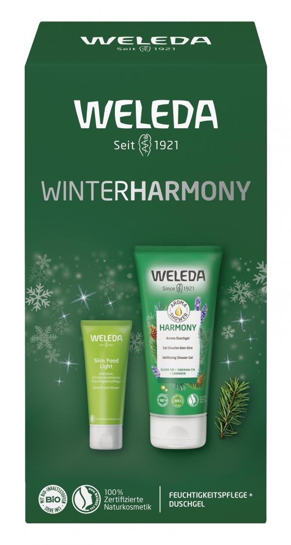 Das WELEDA Geschenkset enthält die Aroma Shower Harmony und die Hautcreme Skin Food Light. Das Duschgel Aroma Shower Harmony bewahrt die Hautfeuchtigkeit, die Haut wird sanft gereinigt und es duftet nacht Waldluft. Es sorgt mit frisch-holzigem Duft für ein natürliches Wohlbefinden. Die Skin Food Light ist eine intensive schnell einziehende Feuchtigkeitspflege für Gesicht und Körper.