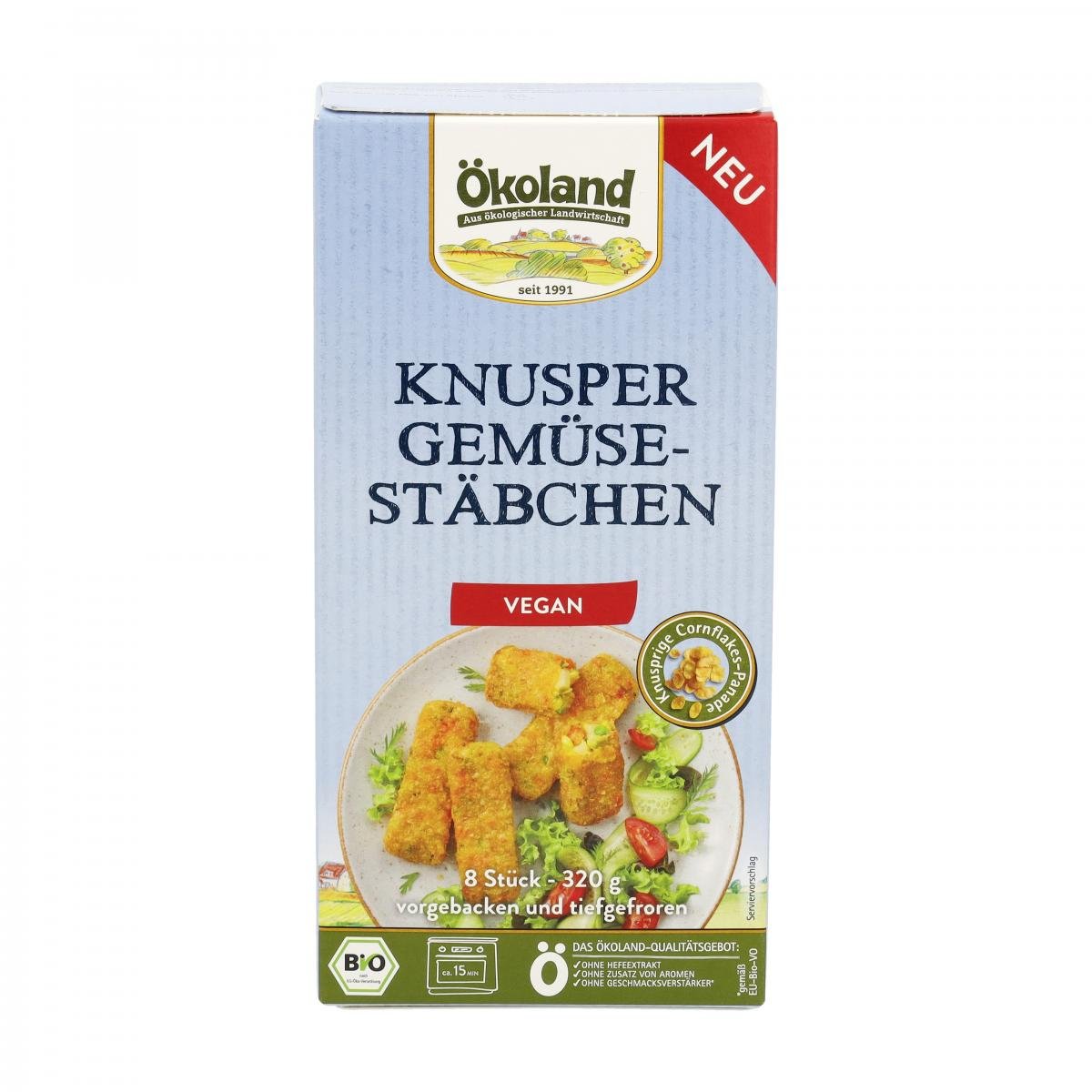 Genießen Sie die veganen Gemüse-Stäbchen in 100% Ökoland-Qualität. Sie überzeugen durch das Zusammenspiel von zartem Gemüse verpackt in einer knusprigen Cornflakes-Panade - einfach zum Reinbeißen. Der angenehme Geschmack und die ansprechende Form geben viele Ideen für zu Hause, Genießen Sie die Gemüse-Stäbchen pur oder gedippt als Snack, als Beilage zu Salat oder Pita, im Burger oder vieles mehr. Je nach Zubereitungsart fix und fertig in ca. 8-15 Minuten.