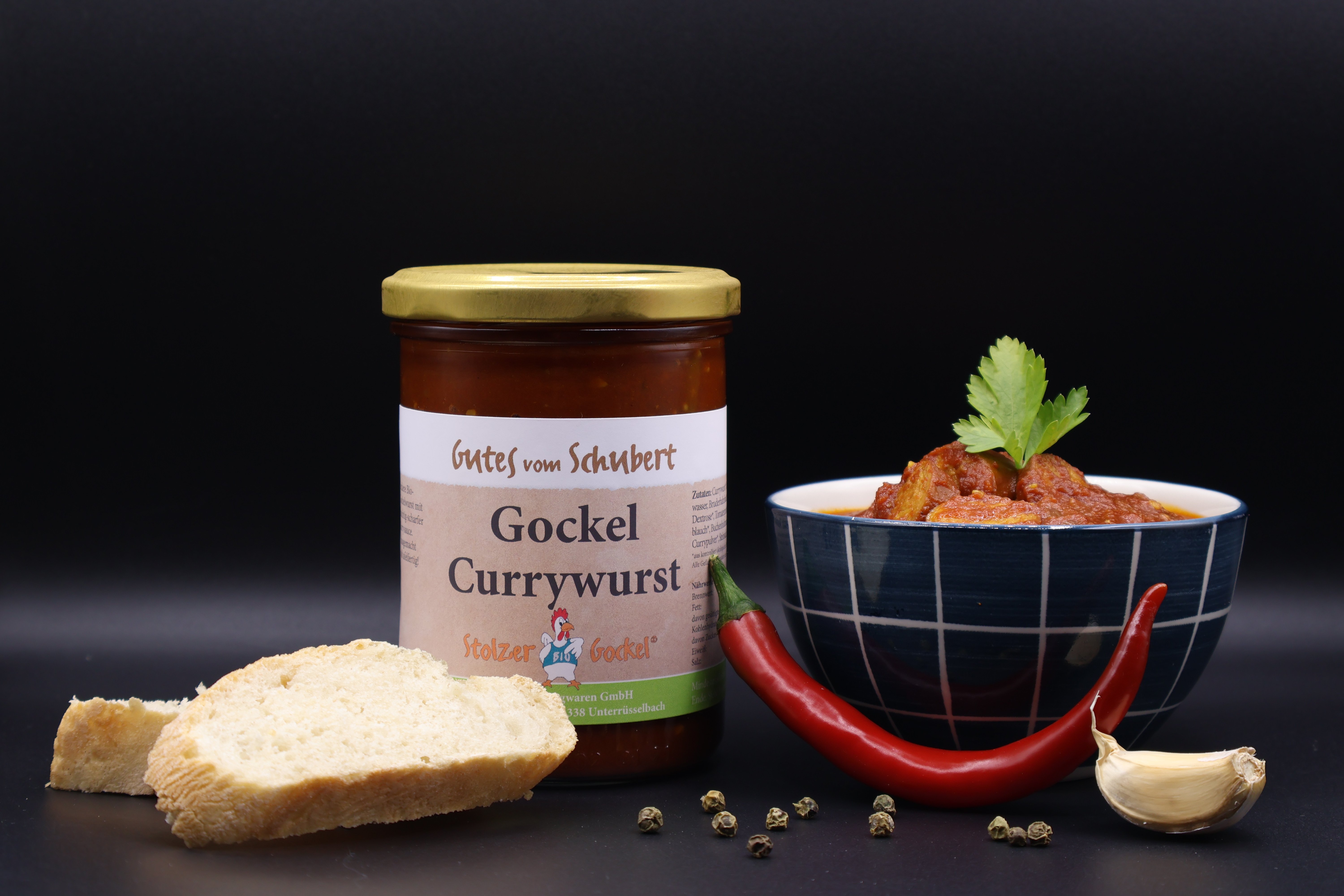 Currywurst* (Hühnerfleisch* (50%), Sonnenblumenöl* (19 %), Trinkwasser, Hühnerhaut*, Hühnerfett*, Steinsalz, Stabilisator: Trinatriumcitrat*, Dextrose*, Tomatenpulver*, Pfeffer*, Paprika*, Chili*, Sellerie*, Zwiebel*, Macis*, Knoblauch*, Buchenholzrauch, Naturdarm), Tomaten*, Zwiebeln*, Rohrohrzucker, Essig*, Currypulver*, Steinsalz, Senfkörner*, Knoblauch*, Chilipulver, Ingwer*, Piment*