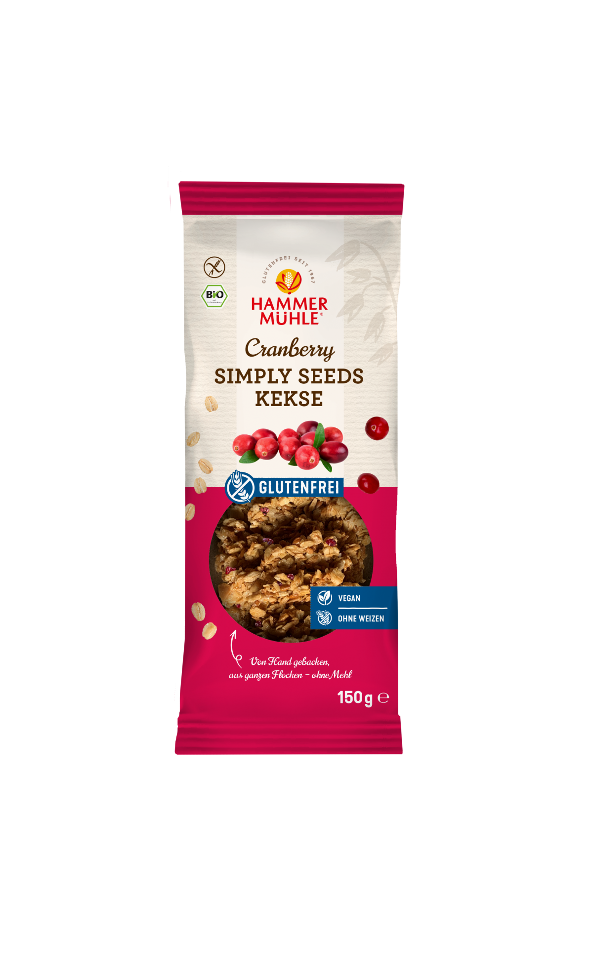 Die Bio Simply Seeds Kekse mit Cranberrys sind vegan, ballaststoffreich und werden ganz ohne Mehl gebacken. Mit fruchtigen Cranberrys.