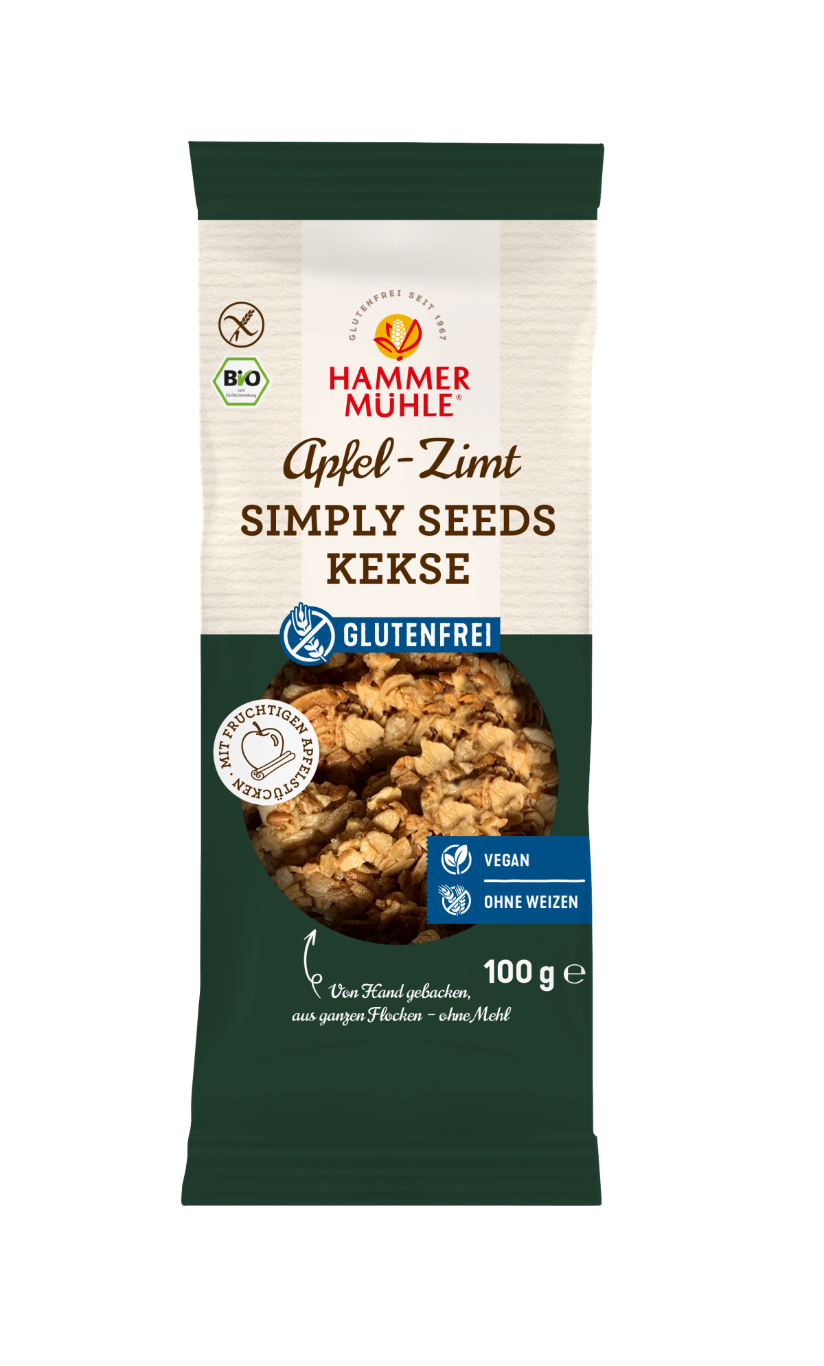 Unsere glutenfreien Simply Seeds Kekse Apfel-Zimt aus Haferflocken und Leinsamen vereinen wertvolle Zutaten mit einem unvergleichlich aromatischem Geschmack.