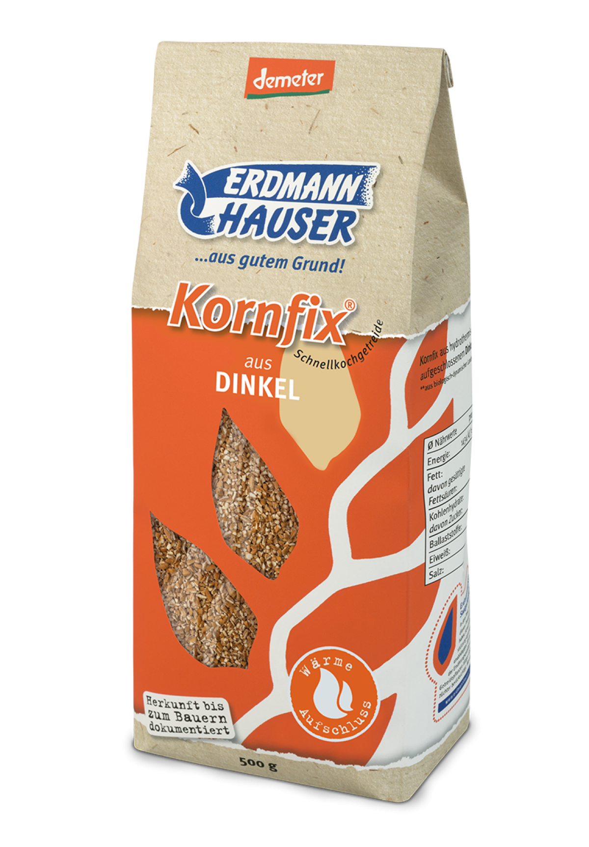 Für Kornfix® wird der Dinkel direkt in einem milden Röstprozess behutsam im Drehofen gedarrt (thermisches Verfahren). Hierdurch erhält Kornfix® sein ganz besonders intensiv nussiges Röstaroma. Anschließend wird das vollwertige, ganze Korn fein gebrochen.