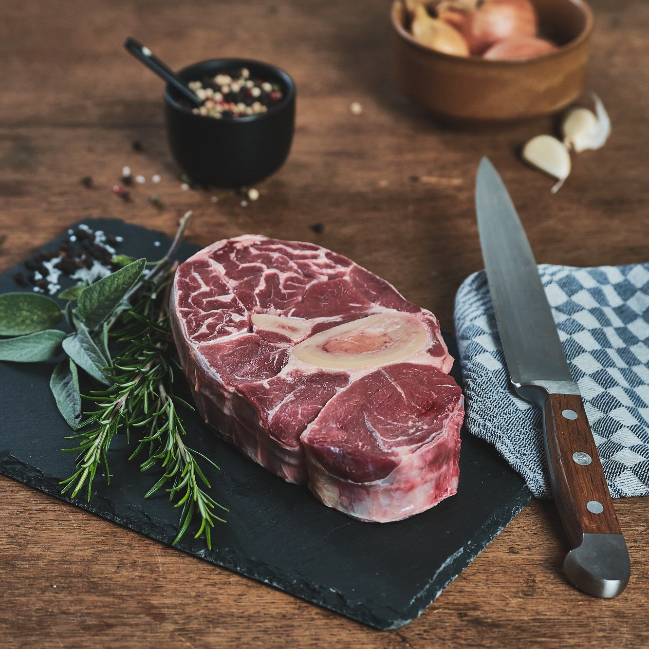 Rinder-Beinfleisch stammt aus dem Unterschenkel, durch langes Kochen oder Schmoren wird das Fleisch besonders zart und erhält so seinen aromatischen Geschmack - hervorragend geeignet für Ossobuco!
