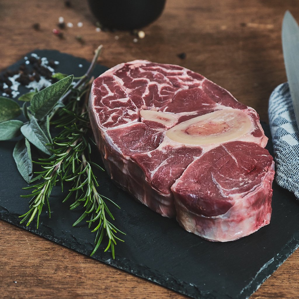 Rinder-Beinfleisch stammt aus dem Unterschenkel, durch langes Kochen oder Schmoren wird das Fleisch besonders zart und erhält so seinen aromatischen Geschmack - hervorragend geeignet für Ossobuco!