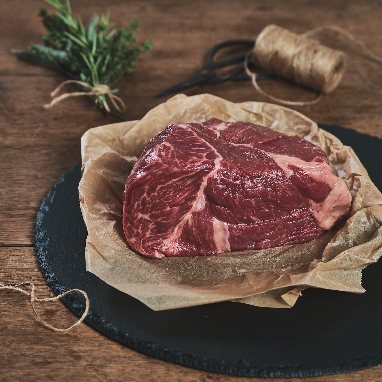 Der schiere Angus Rinder-Braten stammt aus der Schulter: Am besten kurz anbraten und anschließend bei niedriger Temperatur schmoren.